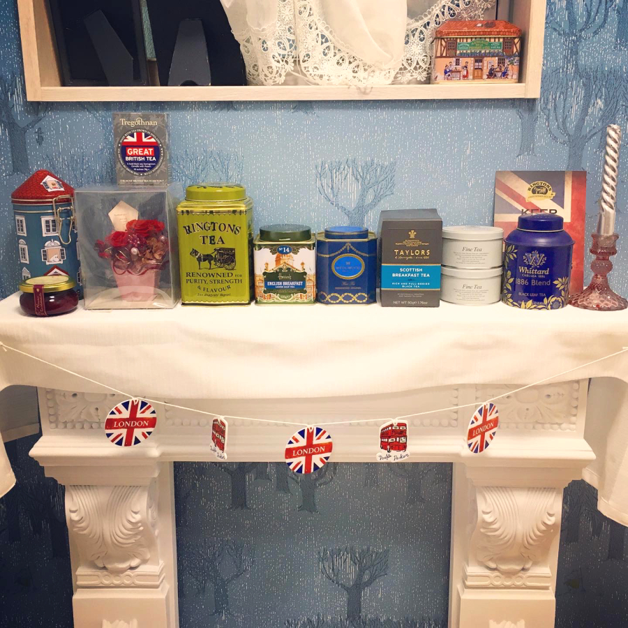 缶は中心のハロッズ缶が一番好きです。英国っぽさを全面に出している飾りは前に百均で仕入れました!