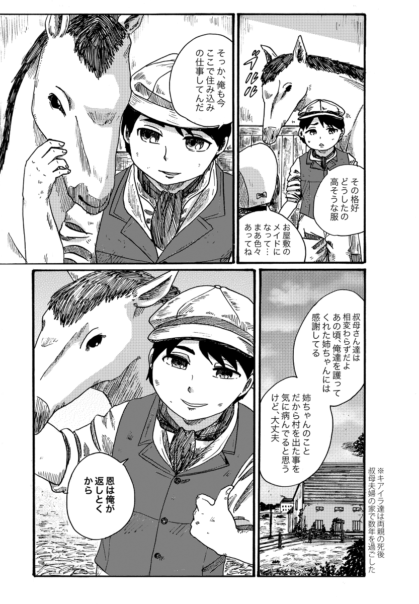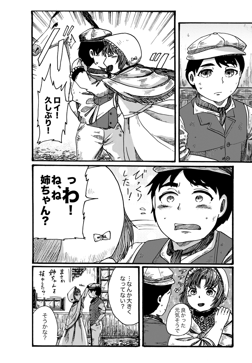 弟との再会 作家:桃の木 2016年05月15日 0 桃ノ木ですイベント前にUPしようと思っていた短編がなかなか仕上がらず昨日やっとこできました!今回はCOMITIA116新刊のヴァンメイ9巻の裏話宿で暇をしていたキアイラが、故郷の近くへ来ているついでに弟に会いにいくお話です弟は3巻(123再録本収録)の夢の中で出てきたきりなので覚えている方がいるかどうか…でも家族についてのお話を投げっぱなしにしてしまうのもアレなのでここに来てやっと少し回収できた感じです全5P続きます 弟は記憶の中よりも大きく、立派に成長していたようです へ[1回]PR