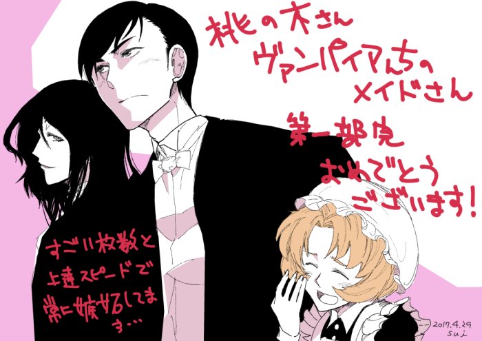 ヴァンメイ10巻直通販のお知らせ お知らせ 2017年05月08日 0 桃ノ木です!ヴァンパイアんちのメイドさん⑩巻を直通販の方に追加しました!ヴァンメイシリーズはBOOTHの方でも再録以外は取り扱っていないのでもしご希望の方がいましたら、オフラインの通販フォームからお申し込みいただければと思いますhttp://mary0mary.blog.shinobi.jp/offlineまた、今回ヴァンメイ完結記念ということでTwitter等でお祝いのイラストをいただきましたので紹介させていただきます! ヴァンメイ10巻完結記念にすいちゃさんからいただきました!すっかり照れ顔になったダグラス。初期の3人メンバーですがこれは紛れもなく最終回以降ですね//さりげなく後ろのトマスさんがイケメン過ぎてやばいです//黎羊さんからいただきました完結記念!二人の距離がラブラブ過ぎてやばいです。バカップル全開です!キアイラが幸せそう過ぎて嬉しいですね〜//末長く幸せになって欲しい…。他にも時々イラストをいただいていたのですがブログの更新を怠り過ぎて紹介できずすみません!個人的には専用フォルダー分けして楽しませていただいています//色々な方にヴァンメイを描いていただけて本当に幸せです!物語はひとまず完結しましたが、今後も二人を描いていけたらいいなと思います へ[1回]