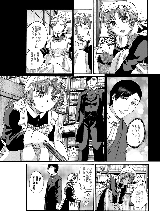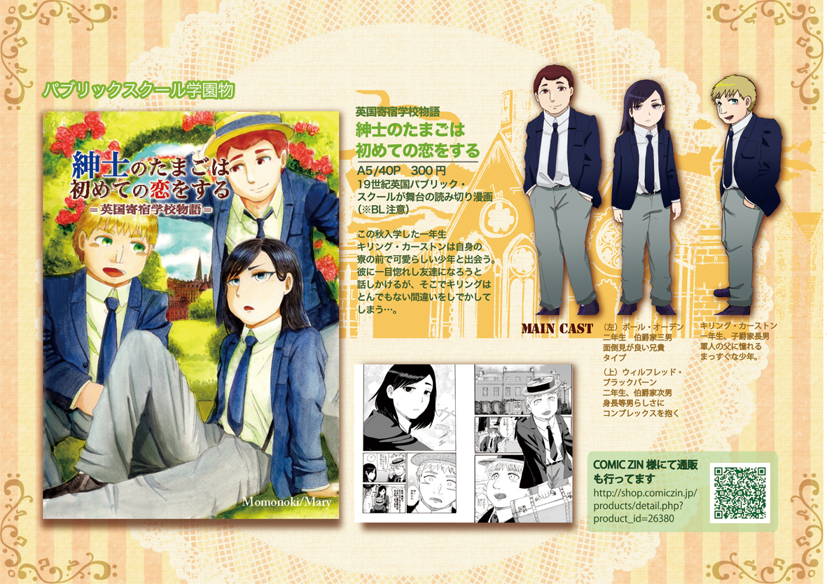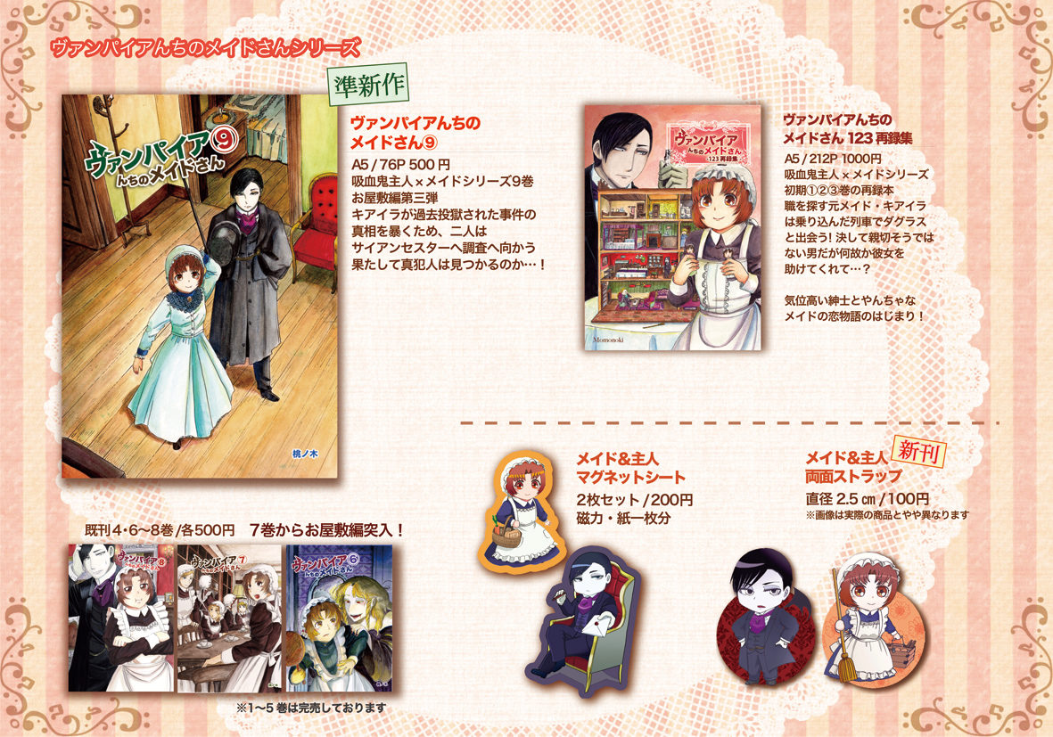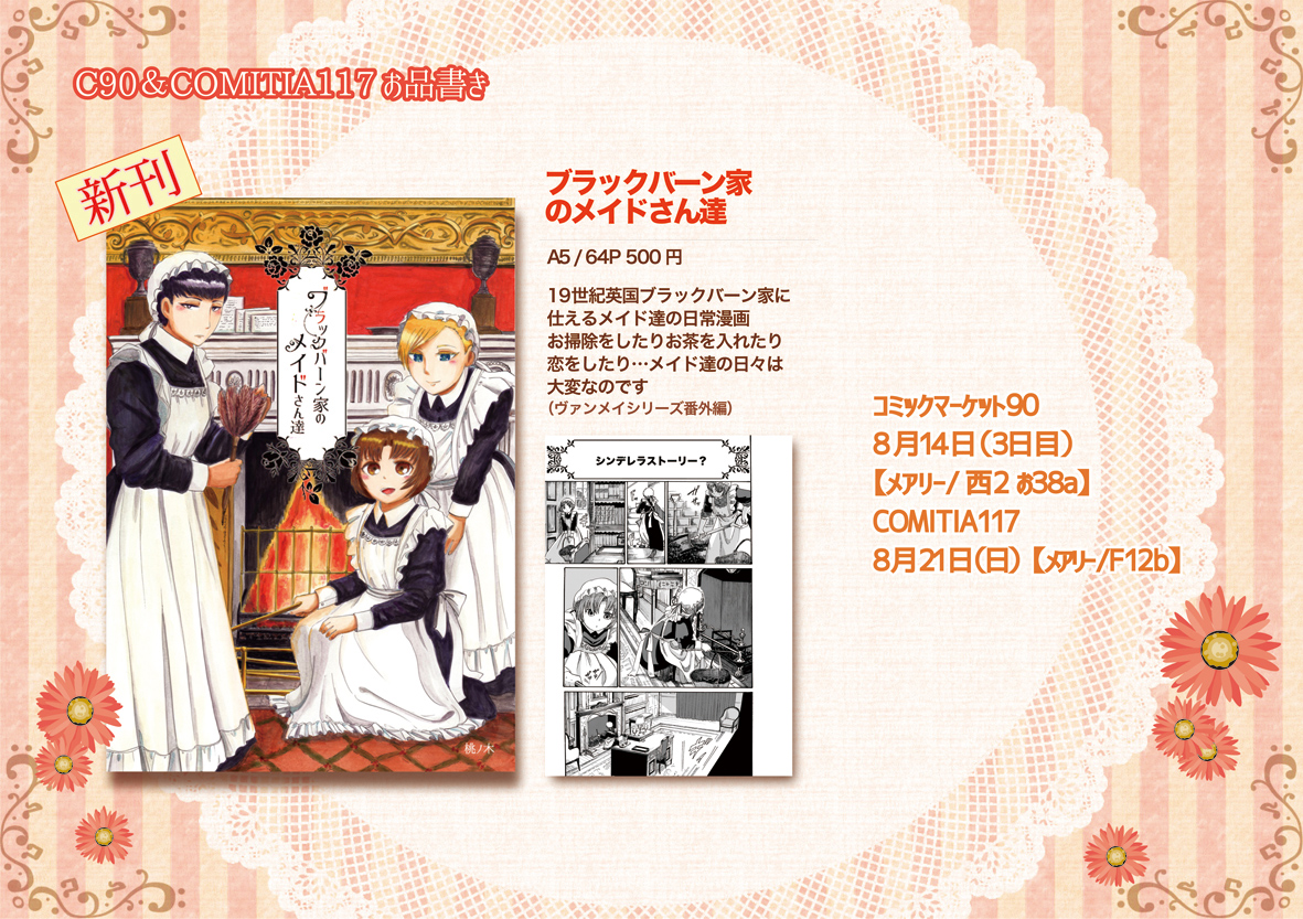 コミックマーケット90参加情報 お知らせ 2016年08月14日 0 (この記事は08月14日までTOPにあります)【オリジナルメイド漫画】ブラックバーン家のメイドさん by 桃ノ木@C90日曜-お38a on pixivお屋敷メイドさん達の仕事を描いた物語 A5/64p 500円予定pixivサンプル:http://www.pixiv.net/member_illust.php?mode=medium&illust_id=58149855桃ノ木です!改めまして宣伝させていただきます夏のイベント参加状況は以下の通りですーーーーーーーーーーーーーーーーーコミックマーケット908月14日(3日目)【メアリー/西2ホール お38a】創作・19世紀英国メイド漫画ーーーーーーーーーーーーーーーーーCOMITIA1178月21日(日)【メアリー/F12b】ーーーーーーーーーーーーーーーーー上の新刊【ブラックバーン家のメイドさん達】が今回の新刊となります!コミケは創作初参加ということで今からとても緊張していますあらすじーーーーーーーーーーーーーーーーーーーーーーーーーーーー19世紀英国のあるお屋敷、主人に恋心を抱く新米メイドキアイラは出世を志し、先輩メイドのカーリーに掃除を教わることに。先輩メイド達との関係や、厳しい仕事のレッスン、様々な困難が待っているのでした… 今回の本はメイドさん達の生活、をテーマに描きました!そのため物語としては薄めで、掃除や生活の様子をじっくり見せるようにしたつもりです。お屋敷の風習や、ご家族とメイドの関わり、みたいな事も多めで色々文献を見てきて、こういうの描きたい!というのを詰め込みました♪ただ、人間関係は割と甘めにしています…【マナーハウス】のような辛く苦しい生活もあったのかも知れませんが…やっぱり明るい話がいいしね!実際楽しいことも…あった筈!そんな感じで、和気あいあいとしたメイドさん達の生活です上のpixivでは、13P程公開しておりますので飛んで見ていただけたら嬉しいです! 後、オマケとしてはヴァンメイ両面ストラップも配布予定です!直径2.5㎝ 100円※少量の為、なくなり次第終了です ダグキアの二人のイラストの入った小さなストラップ 筆記用具のお供にでもどうぞ!(自分の筆箱です)他、コミケでは切り絵をされてる四ノ宮さんがヴァンメイの切り絵を展示して下さることになりました! 原画は私が描いたのですが、切り絵に関する知識が乏しかった為どんな絵が切りやすいのか?というのがよくわからず…割と苦労をおかけしているようです(現在進行形…)超力作になっておりますので是非見にきて下さい〜!!お品書きができました!C90&COMITIA117お品書き by 桃ノ木@C90日曜-お38a on pixiv以上、夏のイベント新作情報でした! へ[1回]