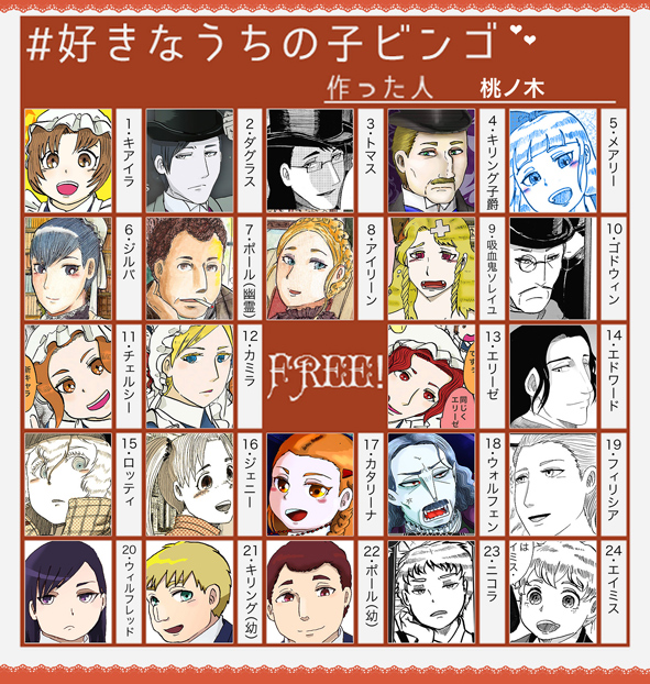 うちの子ビンゴ 作家:桃の木 2015年12月27日 0 桃ノ木です♪Twitterの方でビンゴが流行っているようだったので、便乗してうちの子ビンゴ、作ってみました!コマ数は24なのですが、こうやって改めて考えてみると…キャラ少ないね!!ダグラス・キリング・ポールに至っては年齢違いで無理矢理カウントする羽目に…トマスを=ダグラスの影と考えるなら、彼は三コマ出ている事に…もちろん、発表していない昔のオリジナルキャラクター等を含めたら手持ちのキャラは多いのですが、こうして公にしている子サークル「メアリー」で扱っている子は案外少ないのだなと再認識しました!しかし…上段組はヴァンメイシリーズの主役&レギュラー陣なのですが一巻から登場している筈のトマスに、未だまともなカラー絵がない事も驚きでした(汗)メアリーは、2巻の表紙や6巻の裏に出たり、今年のクリスマス絵だったりで塗ってるし…。なんかこう、ごめんね…って気分になりますね!後はこうして、色々なキャラクターを並べて思う事は作者にはみんな見分けがつくけれど、他の方が見て客観的にどれだけキャラ被りor同じ顔に見えているか、というのが気になりますね(ダグラス&トマスが同じ顔なのは置いといて)未だに昔友達に言われた「描き分けができてない」が心に刺さってたりします(笑)でもね〜、昔の絵とか見ると「確かに…」と思う事があるので事実なのですが。新しいものになればなるほど、客観的に見る自信がないのでどうなんだろ〜?と思いますね!いや、それより先ず、同じキャラを同じ顔で描く、という課題の方が先かもですが!なるべくみんな、個性があって見えたら良いなと思いますうちの子ビンゴ、良かったら遊んでみて下さい♪ へ[0回]