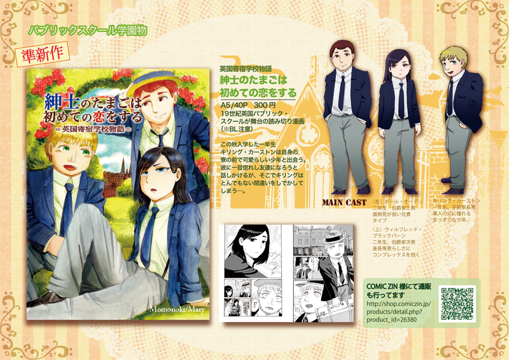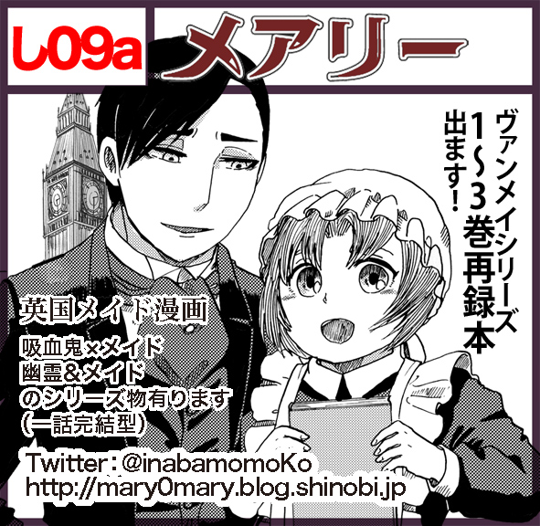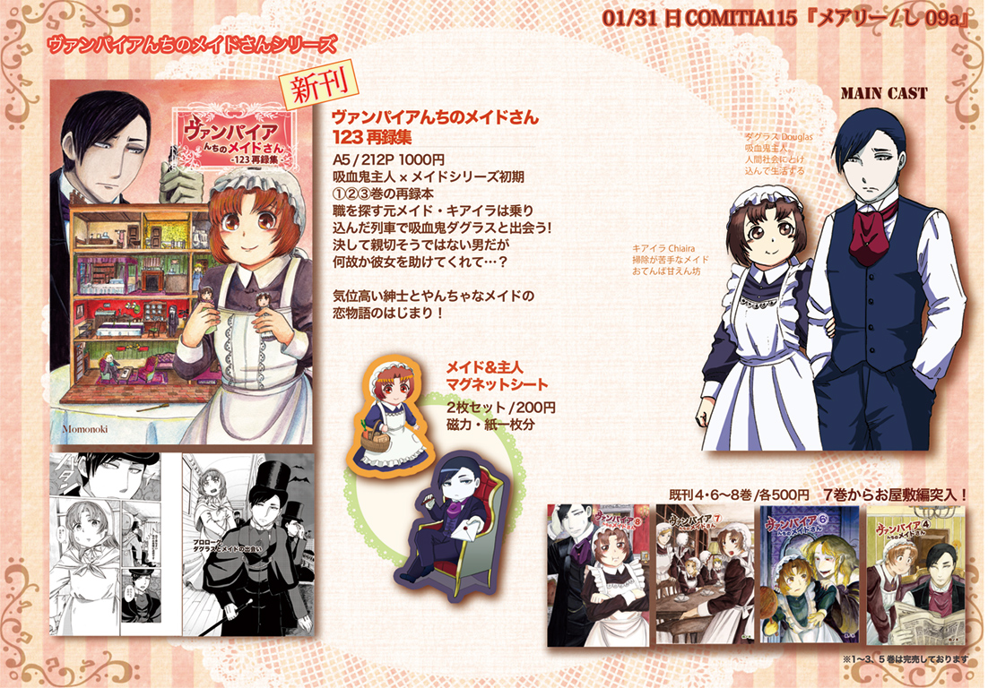 COMITIA115参加情報 お知らせ 2016年01月31日 0 (この記事は01月31日までTOPにあります)こんにちは桃ノ木です!COMITIA115の参加情報をまとめたいと思います1月31日COMITIA115 サークル『メアリー』し09a新刊は19世紀英国漫画・吸血鬼×メイドシリーズ初期を再録した『ヴァンパイアんちのメイドさん123再録本』ですA5/総頁212P/1000円予定①②③巻+書き下ろし主人側プロローグ/24P他作家の、松戸はつたさん、瑛さんにゲスト参加して頂いています!!pixivサンプルhttp://www.pixiv.net/member_illust.php?mode=medium&illust_id=54728278お求め頂いた方にはオマケとしてヴァンメイ1巻表紙カラーバージョンのポストカードをプレゼントします♪また、今回始めてのグッズとしてヴァンメイ二人のマグネットシートを作りました!直径7㎝&8㎝ 二つセットで200円です!他既刊ーーーーーーーーーーーーーーーーーーーーーCOMITIA114新刊紳士のたまごは初めての恋をする19世紀英国、パブリックスクール少年物の読み切り漫画A5/40P/300円他、ヴァンパイアんちのメイドさんシリーズ4・6〜8巻(4巻の在庫が少なくなっております)ジルバさんと旦那様シリーズ2・3巻を持っていきます!お品書き今回も賑やかな机になるかと思われます!売り子さんは前美人の友人とはまた違う方にお願いしました今回も二人体制となる予定ですどうぞよろしくお願いします♪ へ[0回]