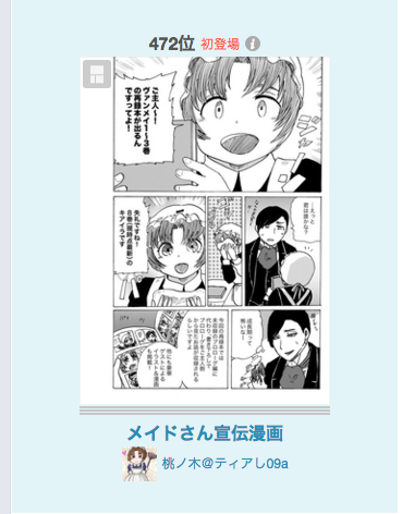 pixivランキング入りしました! お知らせ 2016年01月20日 0 桃ノ木です♪前回ご紹介した「メイド宣伝漫画」がな、な、なんとーー!pixivのデイリーランキングに入りました!!詳細↓漫画デイリーランキング第472位 http://www.pixiv.net/ranking.php?mode=daily&content=manga&date=20160119&p=10#472作品タイトル:メイドさん宣伝漫画作品ID:54787175ランキング入りは初めてなのですが、入ると通知が届くのですね!初めて知りました!今ならまだ掲載されていると思うのでこんな奇跡のような現象を↑見て頂けたら嬉しいです! へ[2回]