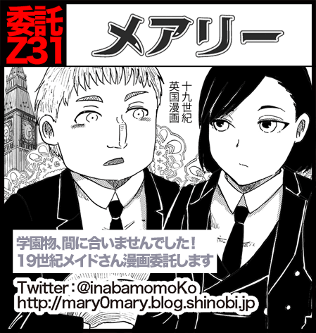 お知らせ色々 お知らせ 2015年11月18日 0 桃ノ木です!イベントの興奮冷めやらぬ今日ですが、二つ程お知らせします♪①11月23日(月・祝)北海道COMITIA3に委託参加します!メアリー/委託「Z31」置かせて頂くのは・ジルバさんと旦那様の時計 300円・ジルバさんと旦那様の未練 300円どちらも19世紀英国を舞台としたメイド読み切り漫画です!どうぞよろしくお願いします♪②COMITIA114新刊「紳士のたまごは初めての恋をする」をCOMIC ZIN様にて委託販売して頂く事になりました!初めての書店委託ということで…とても舞い上がっております//イベントに来れない方や、敷居の高い自家通販を利用するのは…といった方に見て頂けたら嬉しいです//販売が開始されましたら、また宣伝させて頂きます! へ[1回]