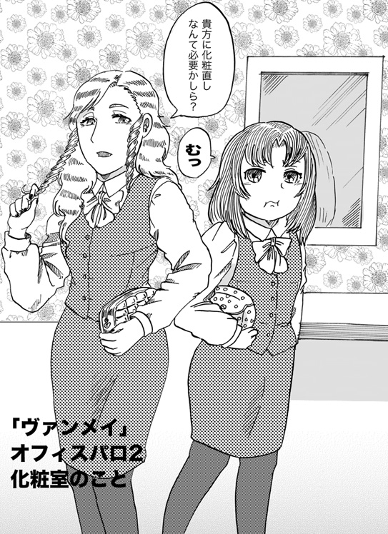 オフィスパロ二回目 作家:桃の木 2015年10月01日 0 桃ノ木です♪ついに10月に入りましたね!私の計算によると、毎日1P描けば原稿の締切に間に合う予定です…が、がんばるイラストは、前に描いたヴァンメイオフィスパロシリーズ(?)二枚目、女子トイレにて牽制し合う元カノと今カノOLさんがいるような会社だと、やっぱり化粧室はうわさ話が飛び交う場所なんでしょうか。 へ[0回]
