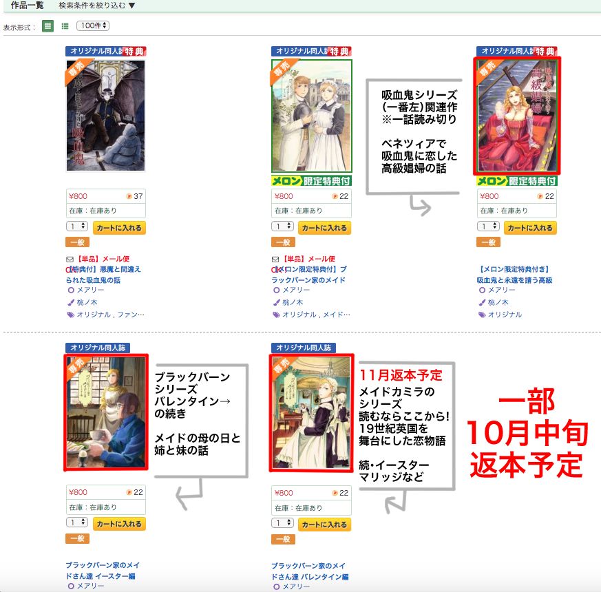 メロンブックス通販、返本のお知らせ お知らせ 2019年09月22日 0 桃ノ木です!以前からご本を取り扱っていただいていたメロンブックス様より一部の本を返本するというお知らせがきました。https://www.melonbooks.co.jp/circle/index.php?circle_id=34274返本されると通販ができなくなり後はイベントと期間限定でやっているBOOTHでの通販でしかお求めいただけなくなります。おそらく余程のことがなければ再設置はないと思うので通知が来た本については今後、お手にとっていただきにくくなるかと…。 返本通知がきたのは、上の画像で赤枠になっている・吸血鬼と永遠を請う高級娼婦・ブラックバーン家のメイドさん達イースター編 バレンタイン編につきましては、手持ちの在庫がないのとイースター編が下げられては残しておく意味が薄くなる為に次回イベントまでに引き下げようと思っているので自主的な返本となります。なので11月のコミティア参加(抽選)が決定したらその時点でお願いしようと思っています。残るは・ブラックバーン家のメイドさん達 マリッジ編・悪魔と間違えられた吸血鬼の二種のみとなり…マリッジ編とかシリーズ後半のみポコっとあってどうするんだ(汗)という気持ちです。一応残しておこうとは思います。吸血鬼の方も、関連作の高級娼婦がなくなってしまうのが残念です。そんな感じでメロンブックス通販のラインナップは10月を境に大きく変わります!特にブラックバーンシリーズは今なら一式読めるので今のうちに通販はいかがでしょうか?どうぞよろしくお願いします。残念なご報告となってしまったので最後にワンダーパーラーさんでのスケッチを置いておきます。メイドさんはいいぞ! へ[1回]PR
