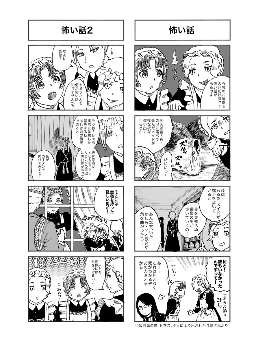 メイドさんと怖い話 作家:桃の木 2015年08月11日 0 桃ノ木です!ようやくトーン貼りも一段落つきましたー♪これで少し安心できる…ホッとりあえず事故でも起こらない限り落とすことはなさそうだぞ!とさあ後は裏表紙を作らなきゃ!四コマ片方のオチはトマスさんですしかしトマスさんは消えますが、本編で消えた事って確か四コマを含めても三回くらいしかないんですよね…彼の体質、誰か覚えているだろうか。作者しかわからない究極の内輪ネタって寂しすぎるっ!!怖い話2そしてカミラさんどーしたの!!?といった感じですね武術の心得があるとかで無双展開でもいいですが冷静に大声を上げたり、警察に連絡したりと対応してくれそうでもある(考えてないんかい!)そして彼女の主人が事知るのは全てが終わった後であった……とかカッコいいな!主人の気を煩わせない使用人の鏡!この四コマは次回新刊にも収録予定です♪他には紳士サイドがシューティングしている話とかあります へ[0回]