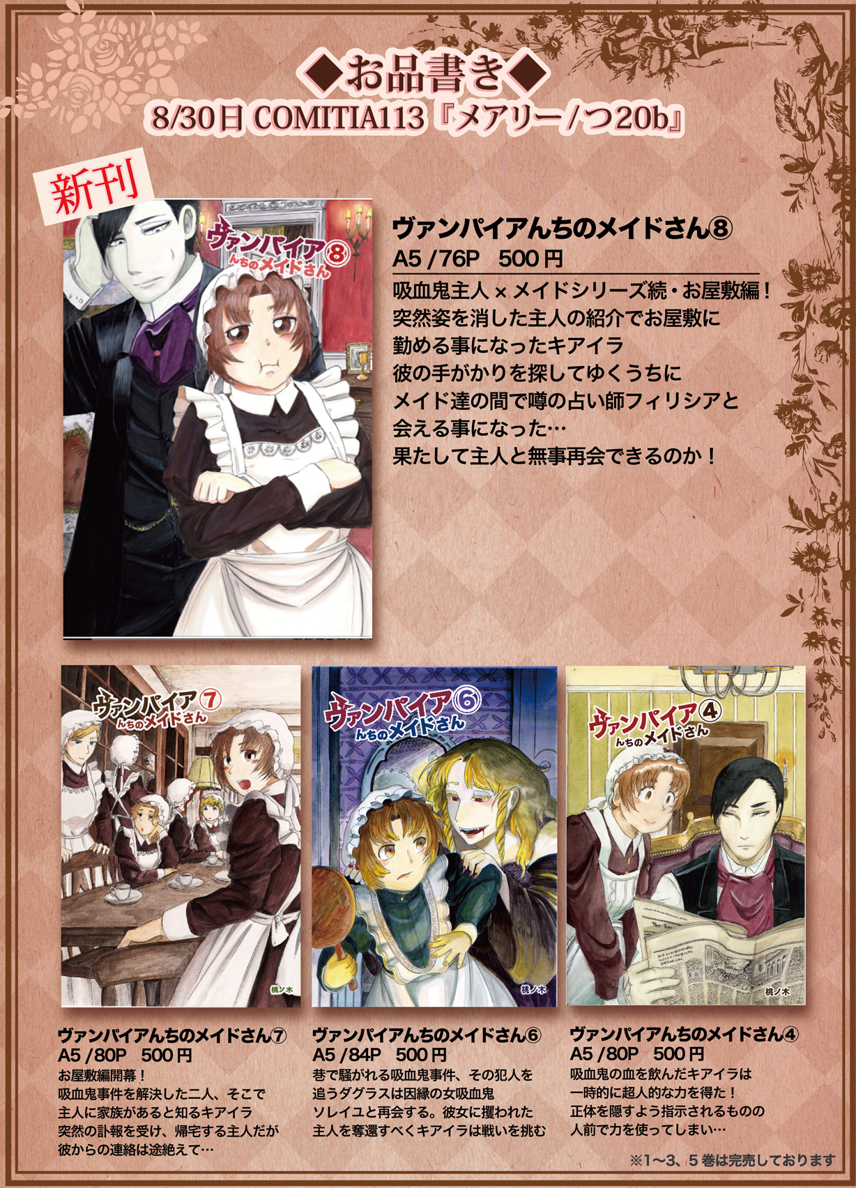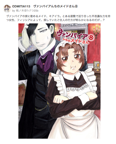 COMITIA113参加情報 お知らせ 2015年08月30日 0 (この記事は8月30日までTOPにあります) こんにちは桃ノ木です!COMITIA113の参加情報をまとめたいと思います8月30日COMITIA113 サークル『メアリー』つ20bCOMITIA113 ヴァンパイアんちのメイドさん⑧ by 桃ノ木@ティアつ20b on pixiv新刊は『ヴァンパイアんちのメイドさん⑧』A5/76P 500円http://www.pixiv.net/member_illust.php?mode=medium&illust_id=52014158ーーーーーーーーーーーーーーーーーーーー吸血鬼主人×メイドシリーズお屋敷編の続編突然姿を消した主人の紹介でお屋敷に勤める事になったキアイラ彼の手がかりを探してゆくうちに、メイド達の間で噂の占い師フィリシアと会える事になった…果たして主人と無事再会できるのか!※⑧巻は⑦巻からの続きとなります、未読の方はご注意下さい!他、既刊の情報は『オフライン』の項目からチェックできますどうぞよろしくお願いします!8月26日追記お品書きをUPしました! 以下、細かいお話 つづきはこちら へ[1回]
