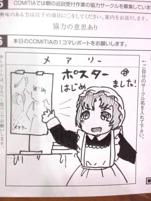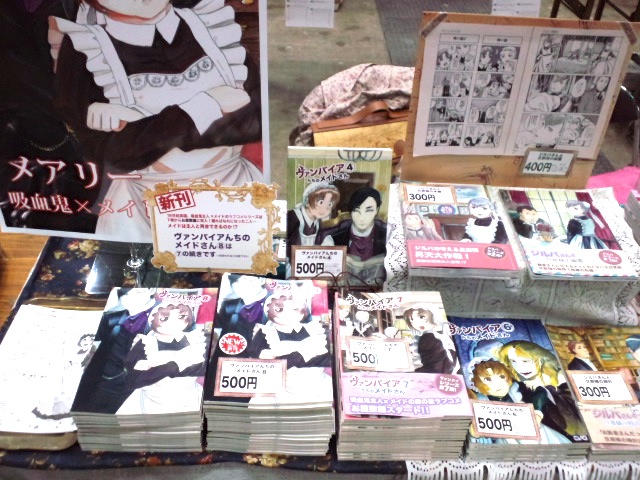 COMITIA113終了 お疲れさまでした! イベントレポ 2015年08月31日 0 桃ノ木です!COMITIA113お疲れさまでした!スペースにお越し頂いた方々、今回宣伝でTwitterでたくさんRTかけて頂いた方々、またわざわざお声掛け下さった皆様本当にありがとうございました!差し入れもたくさん頂いて嬉しいです、後で美味しく頂きますね色々描きたい事があるので、今回のイベントレポは三回に分けて書くことにしました①当日の話②差し入れと頂いた絵のご紹介③打ち上げワンダーパーラーカフェそんな感じでよろしくお願いします♪新刊8巻、ポスター共々、私も初めて会場で見たのですが素敵な出来で安心しました。不思議だったのは表紙とポスターの色味が結構違った事。データは同じだったので、プリンターによって色味が変わるのですね後、今回でジルバさん1が手持ち分は完売しました現在みちのくで送った分があるので、呼び戻せば3冊程戻ってくるかと思われます他、ヴァンメイ④が残り数冊となりました(ちゃんと数えろよっ)恐らく次回でなくなるかと思われます当日は生憎のお天気でしたが、搬入の際にはまだ雨は降らずほっとしました久々のビックサイト、いつ見てもテンション上がりますねー来場者の方は、ロリータや着物等お洒落な方も多いので見ていると楽しいです///ロリータ似合う人が羨ましい///本当は可愛いのも大好きなんだ!色々迷いつつディスプレイ相変わらず品数が多い…!新刊は当日搬入ということもあってたくさん積んでみました!目立っていたら嬉しいです今回初めてのポスター導入だったのですが、やはり縦方向に飾りがあるとぐっとインパクトが上がりますね♪少しは玄人サークル的な雰囲気が出ているかしら…(ふふん♪)そして今回の売り子さんの衣装!素敵///(今回は目線処理必だったので桃ノ木と同じ加工をさせて頂いています)上品なお嬢様風、スカートもボリュームがあって豪華です何となく、黒博物館の学芸員さんに似ていると思うのは私だけでしょうか…?イベント開始後、驚いたのは知り合いに三人も出会った事!大学時代の同期の子と、高校時代の後輩二人みんな創作活動を続けているんだなーと思うと嬉しくなりますね!もしかしたら探せばもっと知り合いがいるんじゃないか…と思えてきます創作楽しいよね!やっぱりいいものです!嬉しかったので一コマレポートでもポスターの事を書きました!もう一方の項目で、『壁ドン』に継ぐ流行ものはなんでしょう?というのがありましたが……全然思いつかなかったので空白になってしまいました他の方はどんなのを描いたんでしょうねーイベント後は打ち上げ的な感じで、初めてメイド喫茶「ワンダーパーラー」へ行きカートを押してへとへとになって帰ってきて…そのまま寝て今やっと戦利品を読み始めている所です♪追々作家の方々に感想をお送りしたいなと思っております!次回の開催は近く、ややスケジュール的に厳しいですが、せっかくやる気も充電されたので何かしら新刊を出したいです♪ へ[2回]PR