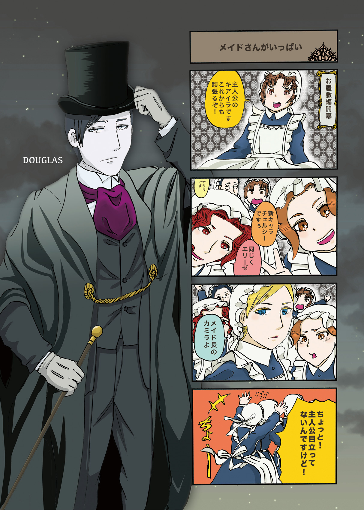 ヴァンメイ7巻裏表紙 作家:桃の木 2015年05月01日 0 桃ノ木です!pixivへUPしたのでこちらにも今回の裏表紙になります!毎度おなじみの四コマ+キャラクター紹介といったスタイルですキアイラ(×2)、メアリーと続き今回はダグラスですこう5頭身の女の子なら全身すっかり収まっていたのですが、流石に大人だとA5サイズの絵では随分と顔が小さくなってしまうので、今回はこんな感じにしました。次回は誰にしようかなーとか今から考えているのですが、とりあえず、お屋敷編が始まりメアリーの出番がさっぱりなくなってしまうので、前回使っておいて良かったなとか思ってます。ともすると、次回は順レギュラーキャラ、トマスやキリング辺りになるのでしょうが実は新キャラのメイドのお姉様方のが出番があり、気分によってはそちらに流れるかもしれません…でもキアイラが衣装チェンジしたし、そっちの紹介でもいいかなあ… へ[0回]
