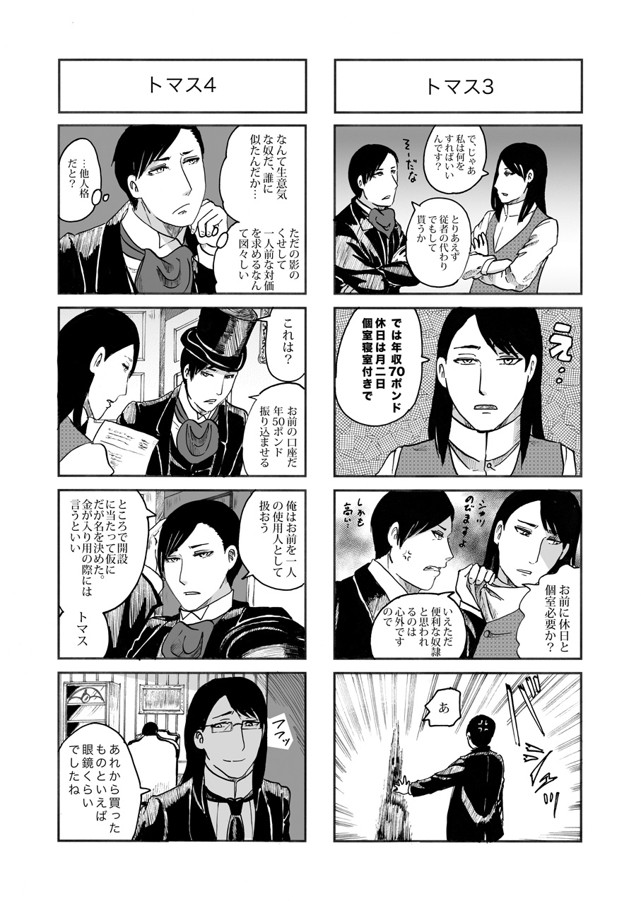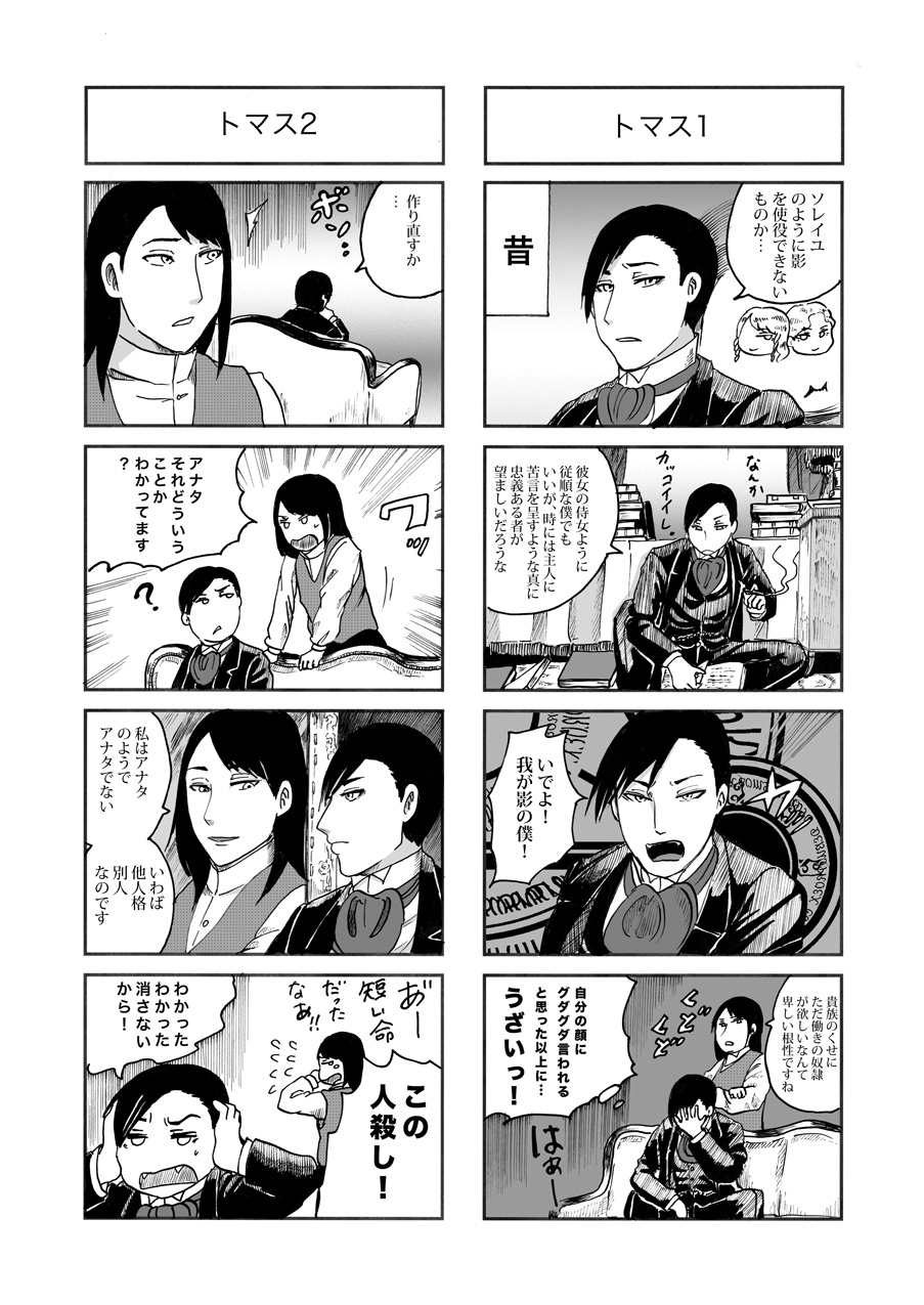 ダグラスとトマスの昔話 作家:桃の木 2015年04月19日 0 桃ノ木です!コミティア新刊に収録した四コマをUPしました今回はダグラスとトマスの昔話です影って何だよって思われる方もいると思うので、補足説明をすると我が家の吸血鬼設定では、吸血鬼の能力で自身の影に実体を持たせる事ができる、というのもがあります。昔新米吸血鬼だったダグラスも、先輩吸血鬼ソレイユ(先輩というか全ての元凶)の術を真似て作ってみた、というのがこのお話。ちなみに二人の影は術者の性能の差で、色々スペックが違うのですが、まあそれはこの漫画にはあまり関係なかったりします。pixivでも公開していますので見やすい方でどうぞ!pixiv=http://www.pixiv.net/member_illust.php?mode=medium&illust_id=49915801にほんブログ村へ へ[0回]