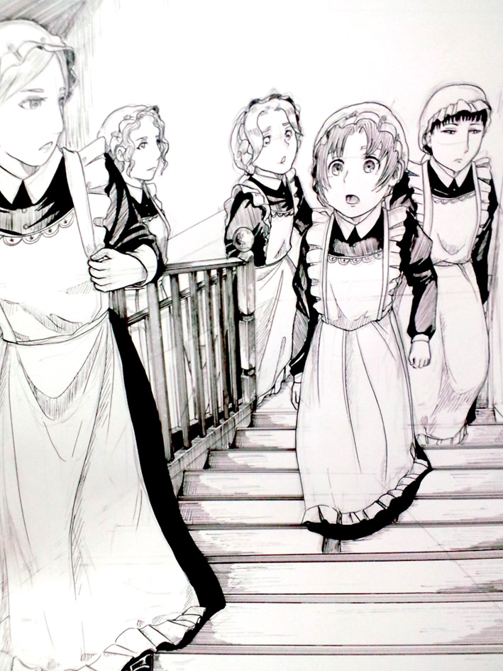 ハウスメイド達 作家:桃の木 2015年03月18日 0 桃ノ木です。もう三月も後半ですねー、少し暖かくなってきたり梅が咲いたりと、春らしくなってきました。原稿も何となく終わる目処が立ってきたので二話目(いつも本は二話入り)の表紙を描きました。来月までにはトーンとか、表紙とかオマケ漫画を残すのみにしたいですね。二話目表紙は、使用人用階段にいる主要メイドさん達。今回お屋敷編ともあり登場人物がぐっと増えるので、なるべく同じ人物に喋らすようにしています。この四人メイド+執事+家政婦が階下で登場する主な人々ですね。フットマン等男性使用人は基本モブってます笑)キッチングループは触れる程度に登場します。この他に階上の家族もいるので、読んだ方はうわー誰が誰やらとなるかも知れません(汗)一応、なるべく見分けがつくようかき分けているつもりなのですが。最悪四人のメイドさんは、ストーリーに絡んでくる一人を除けば他は、新米メイドのキアイラをサポートしてくれるお姉様方、といった塊認識でもいい気がします。いやいいよね!かわいがられる後輩ポジってのもーーー余談最近むしょーに「このままでいいのか!?」的な謎の不安に駆られることがあります。季節柄ですかね、しかしそれは罠なんですよね。原稿を長々やっているとこう手を止めさせようと、わけのわからん不安が降ってくる事があります。「本当に面白いのか!?」「続けていて意味はあるのか?」「上達しているのか…?」人間楽な方に流れるって言うけど、正しい疑問を持ったフリして手を止めにかかってくるから困り者です。最終的には「そんなん知らん!描くぞ!」って振り払ってます。多分これで、あっている筈です!にほんブログ村 漫画ブログ へ[3回]