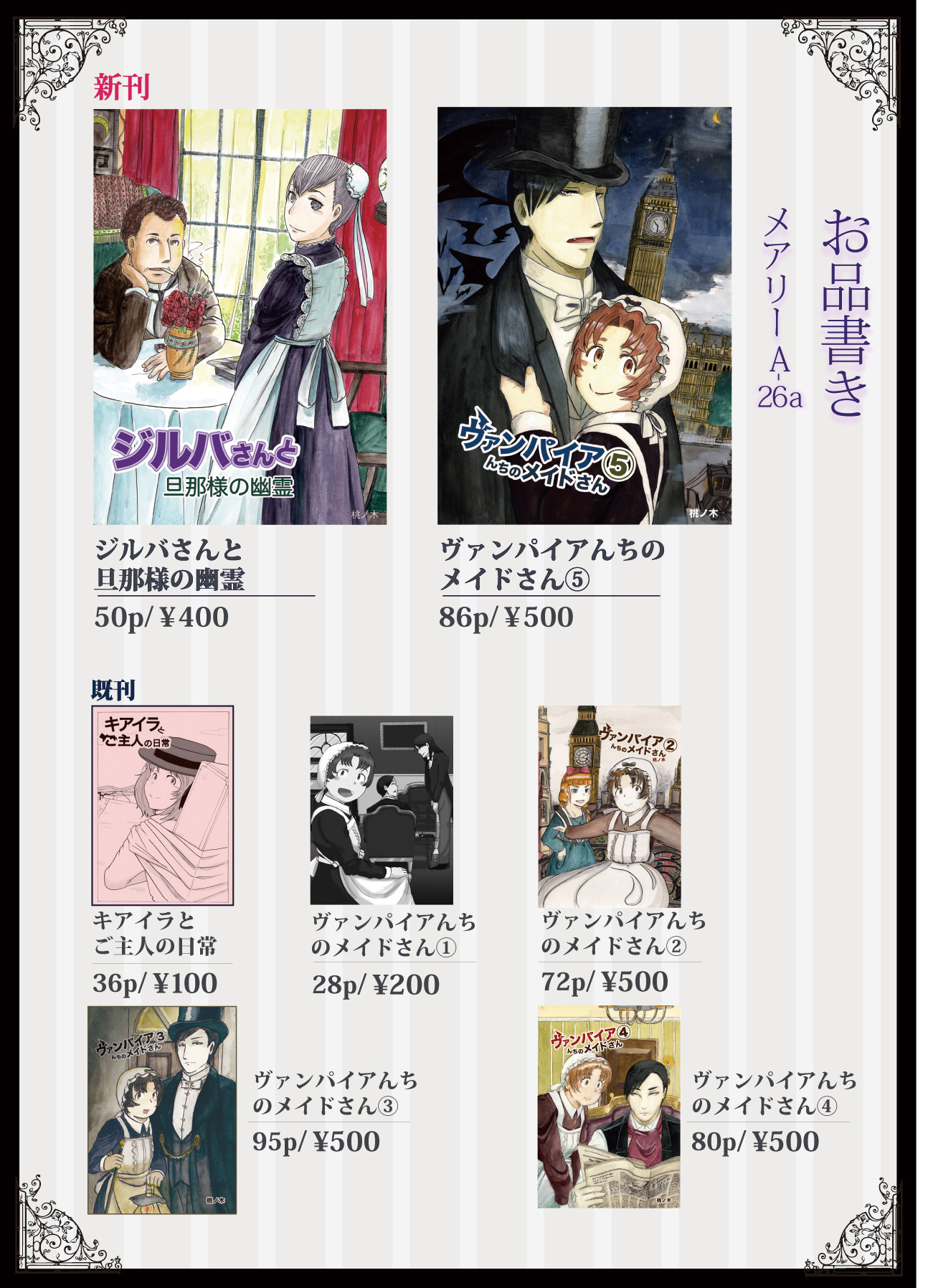 COMITIA109のお知らせ お知らせ 2014年08月31日 0 (この記事は8月31日までトップにあります)桃ノ木です!COMITIA109の情報です。今回から桃ノ木のみの参加となります、ご了承ください。新刊二冊ヴァンパイアんちのメイドさん⑤ by 桃ノ木/ティアA26a on pixivA5/86/500円ヴァンメイシリーズ第五巻です。ジルバさんと旦那様の幽霊 by 桃ノ木/ティアA26a on pixivA5/50/400円読み切り、メイドさんと幽霊の旦那様のお話です。世界観は上のシリーズとつながっている設定ですが、絡み等はありません。他、桃ノ木既刊も持っていきます。お買い上げいただいた方にはペーパーもお付けします♪当日は(長く見積もって)12時頃まで出かけている予定です、その間販売は売り子の友人にお任せする予定なので、御用の方は午後に来て頂ければ幸いです。追記:お品書き作りました つづきはこちら へ[0回]