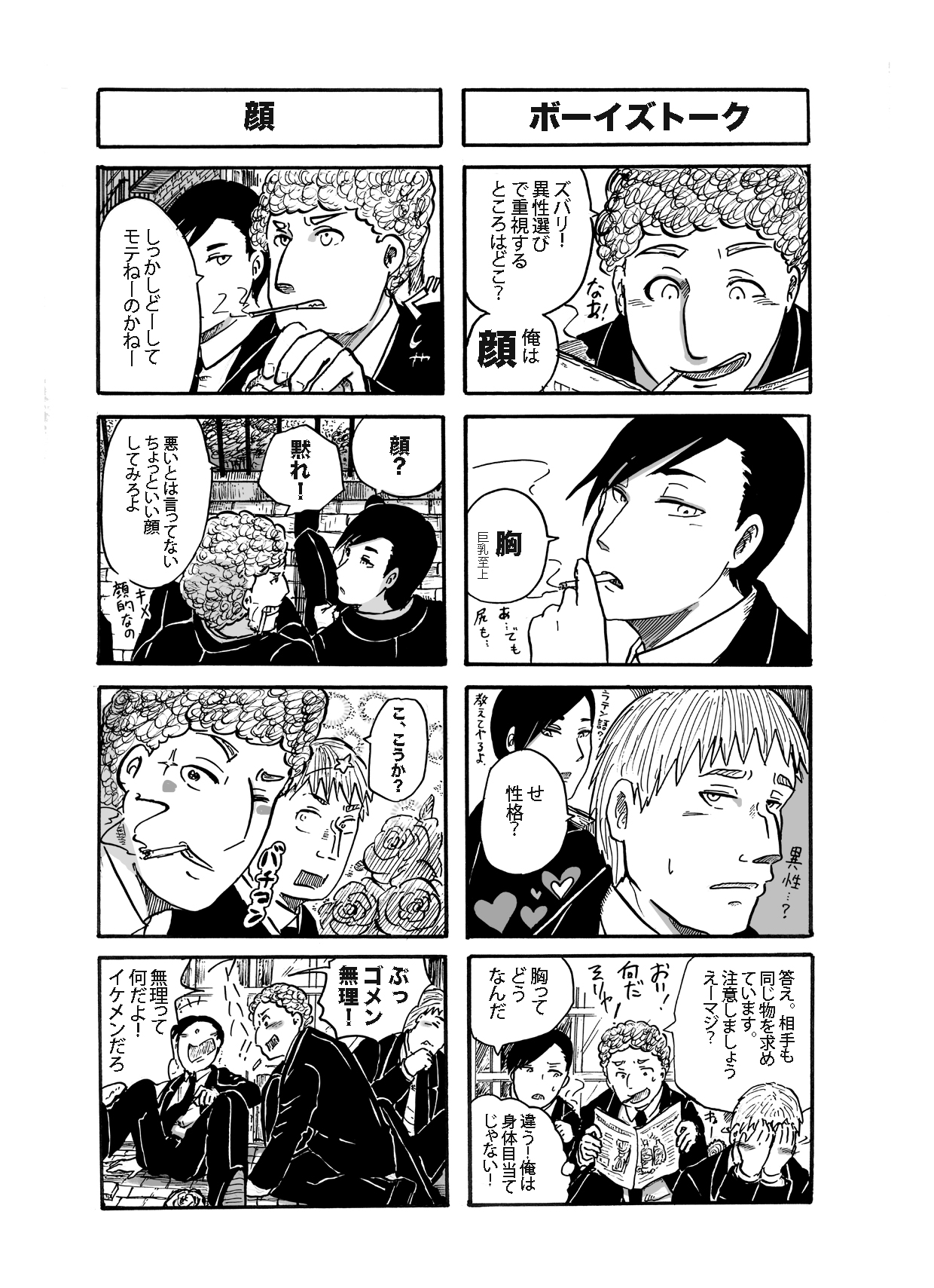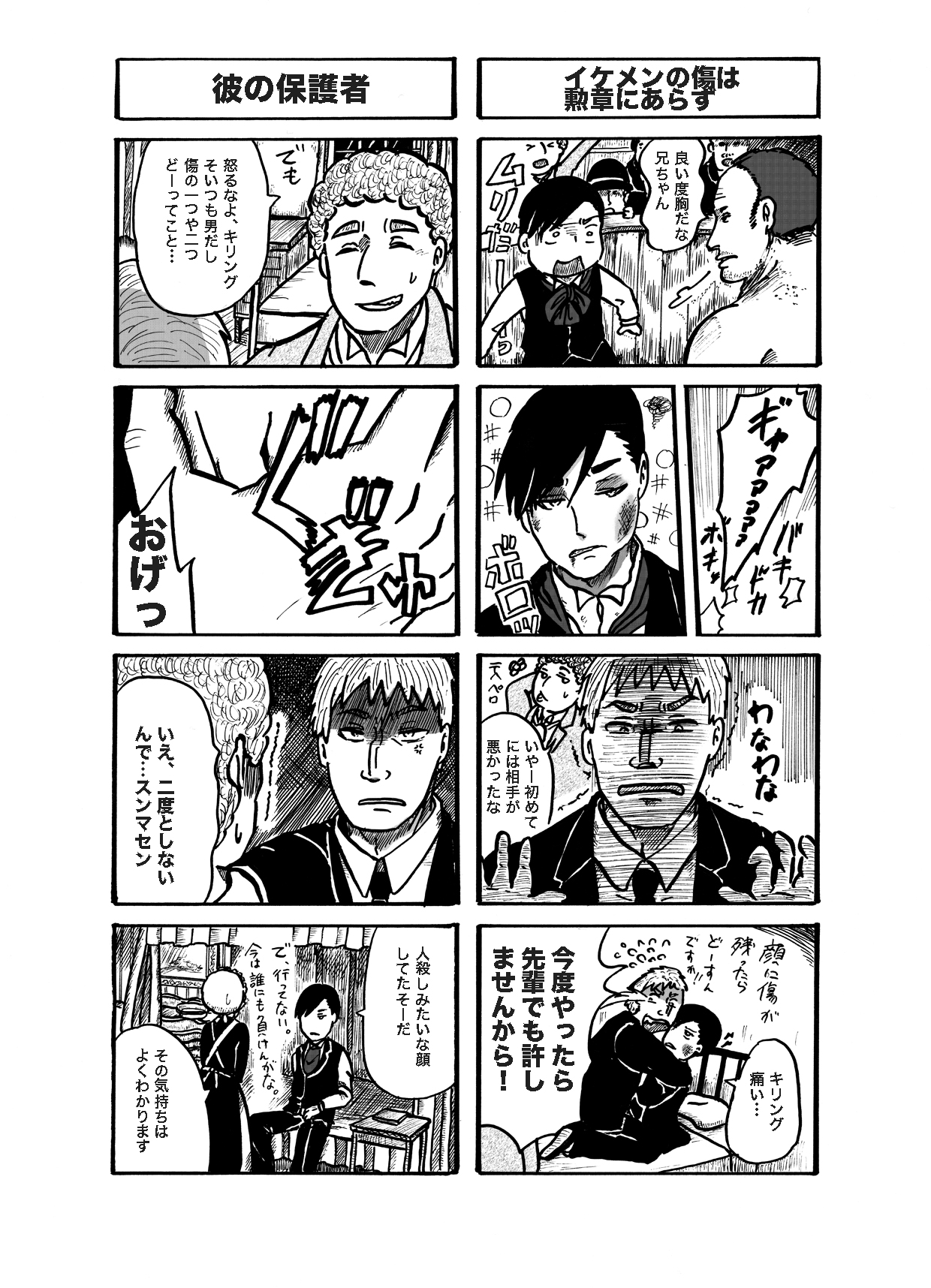 四コマアップしました 作家:桃の木 2014年06月12日 0 桃ノ木です。pixivに出した四コマ、こちらにもアップします。…データがでかいかな?ヴァンメイ④巻6話のあるシーンの続きからとなりますが、別に内容が続いている訳ではないです。他、ダグラスの昔話。ぶっちゃけ、ダグラスの年齢的なネタバレなのかもしれないけど(数百年を生きた吸血鬼ではないとか)、まあいいか、と。しかし五十年そこらの吸血鬼と知ると途端貫禄がなく感じる不思議。やーやっぱり吸血鬼っていうとつい百年は生きてるだろうって気がしちゃいますよね。まあ少なくとも外見=年齢でないだけマシという事で…… へ[0回]