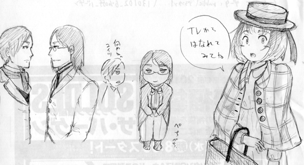 トーン貼り終わった! 作家:桃の木 2013年06月19日 0 桃ノ木です。絵は、ファイルの間から発掘した落書きです。トマスの服が曖昧なので、多分前回の話を描く前に書いたんだろうなーで、今の原稿なのですが、トーン貼り終わりました!!作業の中でもなかなか苦手なトーン貼り・・・・本当コミスタ欲しいなあと思った期間でした。トーン代を考えてしまうと、思う存分貼れない貧乏性なので、そういう意味でもデジタルの方が向いてそうだなあとは思っています。一応、一話の区切りはついたので次回のコミティアには絶対本が出せそうです。が、できれば短編をもう一話収録しようと思っているので、作業はまだまだ続行です! 後合本も出せたらいいな!後、どうでもいいですが、最近南が家康でフィーバーってますが、私は三成派です。 へ[0回]