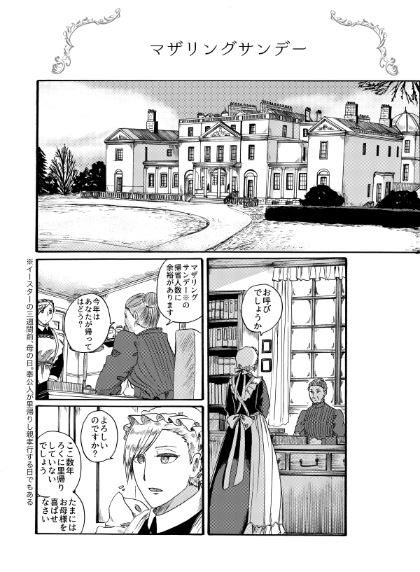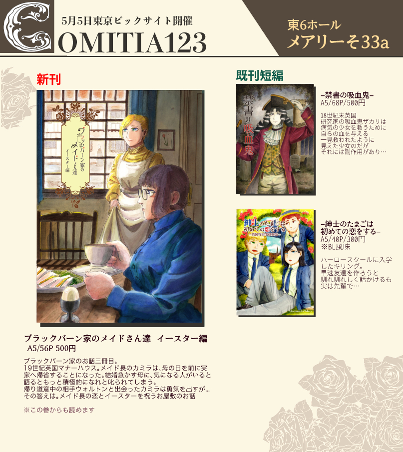 新刊のお話 お知らせ 2018年04月23日 0 いよいよ明日ですね!こちらがお品書きになります。ブラックバーンシリーズは持ち込み多め、他ヴァンメイシリーズは少なめです。在庫が少ないものに関しては・ヴァンパイアんちのメイドさん7巻・ブラックバーン家のメイドさん達(無印)以上の二点が残部が少なくなっております。これらは在庫残りなく持ち込んでいるので、気になる方はお早めにどうぞ!体調があまりよくないので、何かぐったりして見えたらすみません(汗)欠席するような事はおそらくないと思います!ではでは、明日はどうぞよろしくお願いしますー!5月5日(土)東京ビックサイトで開催のCOMITIA124の新刊です『ブラックバーン家のメイドさん達 イースター編』A5/56P/500円【メアリー/そ33a】19世紀英国、お屋敷メイド本第三弾!進展するカミラの恋と、イースターを迎えたお屋敷のお話※この巻からもお読みいただけます今回はお屋敷の3月〜4月頃が舞台です雪景色は作画楽だったけれど、枯れ木が大変だったなあ…とそんな冬も終わり春がやってきます。英国の母の日は日本より早くイースター前にありメイド長のカミラが実家に帰省します。舞台がお屋敷外になるので、前半はメイド成分少なめ後半はキアイラの勧めでご主人がエッグハントをするお話です 前回のバレンタイン編に引き続き、カミラの恋も進展しますいつも年の差カップルを描いてはいますが、今回は初めてのお姉さんと年下男子の組み合わせ。お姉さんとして落ち着いていたいのに余裕がなくなるカミラと若さゆえか(?)わんこのようにまっすぐなレオン………本当にいつもの逆ですね。うまい感じにできていれば良いなーと思います他、既刊も諸々持ち込みます。ブラックバーン家シリーズでもよくいちゃいちゃしているご主人とキアイラのメインストーリー「ヴァンパイアんちのメイドさん」456(再録)〜10巻ブラックバーン家のシリーズへ至るお話やお屋敷の秋から年末までのお話もあったりします。・吸血鬼であるご主人に関係する古い物語「禁書の吸血鬼」・ご主人の小さな学生時代の思い出「紳士のたまごは初めての恋をする」など番外編も諸々持っていきます。今回はブラックバーン家メインのスペースとなるので、他シリーズは少なめの予定ですまたお品書きなどできましたら更新します! へ[1回]